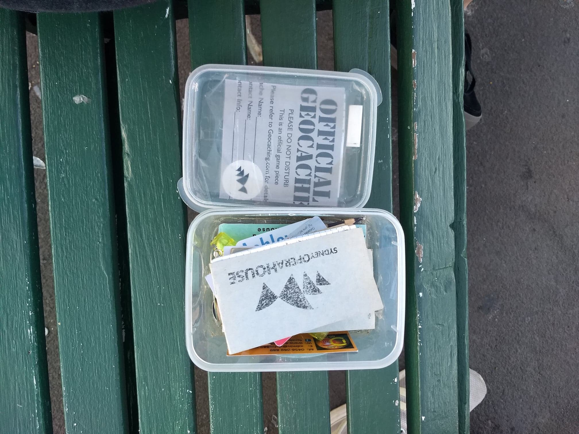 Inside, there is usually a log where you write down your name and date to say you have found it. Some have little toys or ‘swappable’ which are mostly aimed at kids, and some contain ‘trackables’ which are meant to be taken and moved from cache to cache. I took a trackable (TB) from a cache I found next to Sydney Opera house and left it in a cache back in the UK. You track the serial number online so everyone can see its journey.