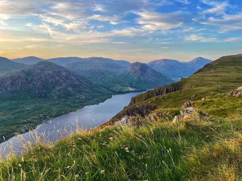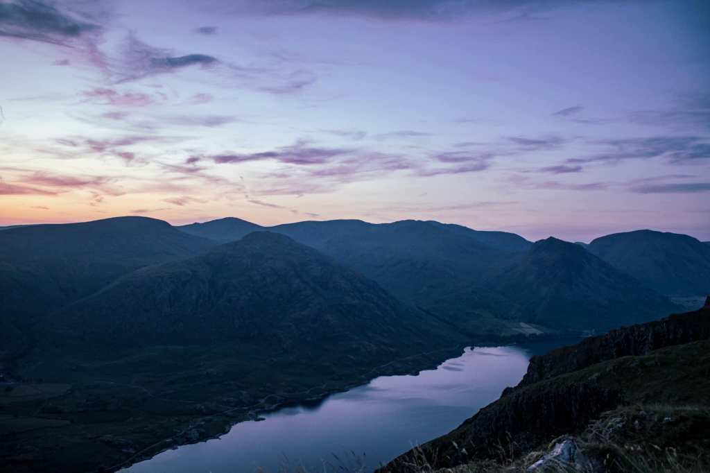 Breezy but very warm summers evening. I took my Thermarest Trekker Chair to sit outside my tent in reasonable comfort. The pink gin came out, and there was nothing else to do but watch the sunrise descend behind Middle Fell. You also get a view of the coast by Whitehaven, and on a clear day, you can see the Isle of Man. As the sun set, the sky had a blue/purple haze which hovered around Wast Water. The view up there is stunning. You can see right down the valley to Scafell. Sunrise was equally impressive, and I got some pics before packing up and descending and round 2 of dodging horseflies.