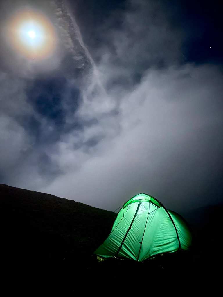 Almost a perfectly timed pitch-up, the rain came lashing down, bringing hail and ice. I took refuge in the tent for most of the evening, occasionally opening the entrance when it stopped raining to see if any fog had cleared. Occasionally I got a sneak peek of the view whilst keeping myself warm with a hot water bottle and a glass of rum and coke.