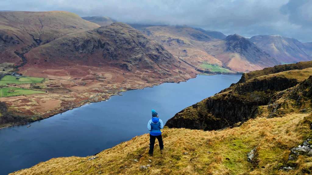 The temp was around -3, so it was pretty cold. The wind picked up in the evening, and in the morning, it probably topped over 40mph (despite it not being forecast). The ground was very soft, so it pulled up a few pegs. Trying to get the tent down without it blowing away was a challenging experience. But after being heavily buffeted on the way down, it calmed halfway down. On the bright side, the fog had cleared, and I could see the snow that had fallen on Scafell down the valley.